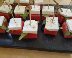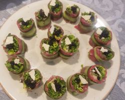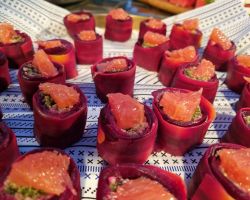 - קרפצ'יו רול עם ארוגולה וקויאר בלסמי / סשימי סינטה על סאמבל עגבניות.